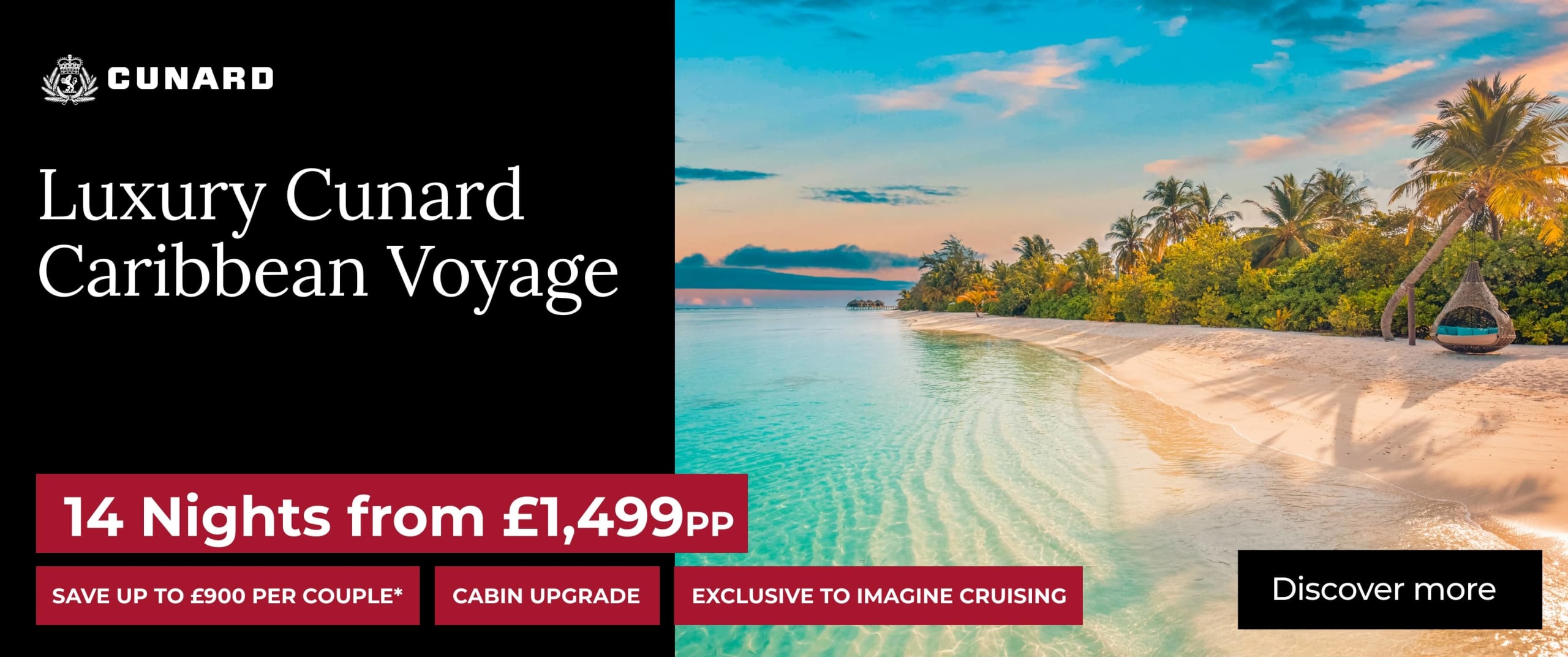 Chase the sun in winter 2026 with an exclusive Caribbean roundtrip cruise from Miami onboard Cunard’s Queen Elizabeth — where sun-kissed shores and endless adventure await. book by 19th December to take advantage of this exclusive offer.