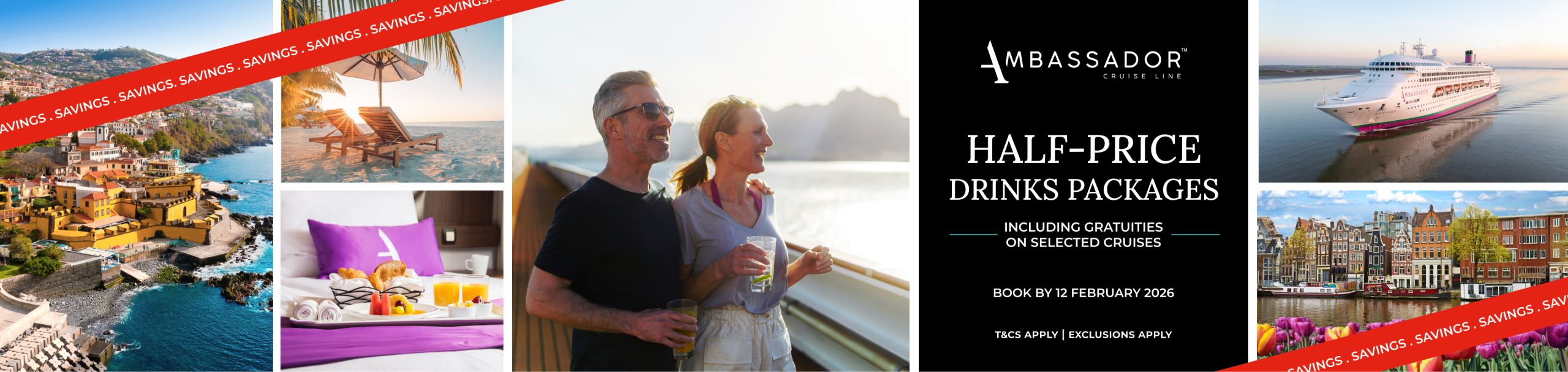 Half price drinks offer is valid on new bookings only on specific sailings from 09:00 18th December 2025 until 23:59, 12th February 2026 inclusive. Half Price drinks offer is per person and is valid for up to two adults purchasing the Ambassador fare, 3rd/4th berth are not eligible for the Half Price drinks offer. Half Price drinks includes our Expedition drinks package including gratuities and must be purchased at the point of booking. Half Price drinks offer is only valid on selected Ambience and Ambition 2026/2027 and 2027/2028 season sailings. See website for full details. Half Price drinks offer may be withdrawn or changed without notice. Please note this promotion is not applicable to any festive/in port events, charters, fly cruise or any booking made outside of the above sailing dates.