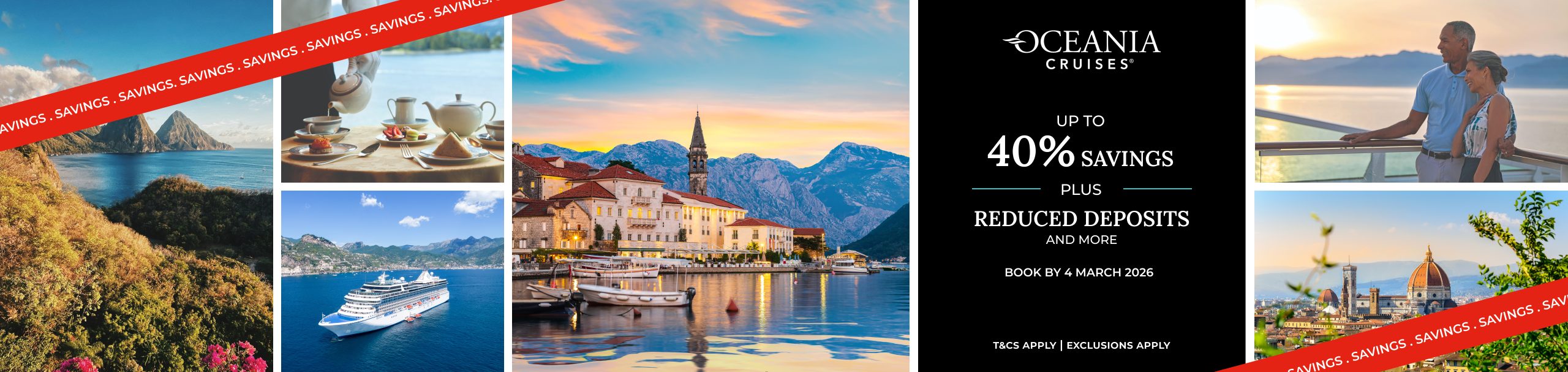 *Offers, fares and itineraries are accurate as of 11 December 2025 and subject to change or withdrawal without prior notice. Advertised fares may fluctuate and are subject to change. Upgrade Your Experience sale is valid from 11 December 2025 until 4 March 2026. Choice of Double Shore Excursion Credit or Unlimited Wine, Beer & Spirits plus Up to 40% Off and 50% Reduced Deposits are available for select categories on select sailings, subject to change and capacity controlled. Unlimited Wine, Beer & Spirits is valued at US$89.95 per person per day. Unlimited Wine, Beer & Spirits includes a selection of wine by the glass, beer, spirits and cocktails from our General Bar & Martini Bar Menu, available at any on board venue as well as through room service during operating bar hours. Certain exclusions apply. Mention Code WV. 50% Reduced Deposits applies for new bookings only and if departure is outside of final payment; valid until 4 March 2026; this offer is not valid on Around the World Cruises and segments. Certain exclusions apply. For Your World Included amenities, guests in the same stateroom must choose the same amenity. Choice of amenity must be made by final payment date and is not applicable to third and fourth guests in any cabin. Amenity choices are (1) Complimentary Wine & Beer or (2) Shore Excursion Credit. If no amenity is chosen, a non-use credit will be applied to final payment: up to 9 days receive £100 credit per stateroom; 10-13 days receive £200 credit per stateroom; 14-19 days receive £300 credit per stateroom; 20-25 days receive £400 credit per stateroom; 26+ days receive £500 credit per stateroom. Complimentary Wine & Beer includes a selection of wine by the glass or beer from our General Bar Menu, available at any onboard venue during operating lunch and dinner hours. Certain exclusions apply. If Shore Excursion Credit is selected, all excursions must be chosen at least 14 days prior to sailing. Value of shore excursion credits varies by voyage length and is per stateroom except for a single traveller booked in a Solo category or booked with a single supplement discount, where amenity is per guest. Voyages (1) up to 9 days receive Shore Excursion Credit of US$400; (2) from 10-13 days receive US$600; (3) from 14-19 days receive US$800; (4) from 20-25 days receive US$1,000; and (5) greater than 26 days receive US$1,200. Any unused Shore Excursion Credit can be used as shipboard credit on the same voyage or will otherwise be lost upon debarkation. For more details about Best Value Guarantee, visit OceaniaCruises.com/legal. All fares are per person in Pounds Sterling, valid for residents of the United Kingdom, based on double occupancy (unless otherwise noted) – except fares for Solo category are for a single traveller and are based on single occupancy – for new bookings only and may be withdrawn at any time. Airfare including complimentary transfers is available on request and at an additional cost; please call for more information. Unlimited WiFi amenity does not include streaming and includes a login for the first two devices per stateroom (one login for solo traveller). Visit OceaniaCruises.com/internet for more details. All cruise fares include gratuities for stateroom/suite attendants, butlers and dining waitstaff, as well as government taxes and fees. For other services or purchases made onboard, additional gratuities of 20% apply. Not all promotions are combinable. Fares may vary by sailings and any “Fares From” pricing is based on the lowest available category at the time of publication, unless otherwise indicated. Suite and stateroom measurements are approximate, and those in same category may vary in size. Suites and staterooms may also have different furniture placement than depicted in the photographs. We may collect, use, share and secure your personal data as described in our privacy policy, which is available on our website at www.OceaniaCruises.com/legal/privacy-policy Oceania Cruises reserves the right to correct errors or omissions and to change any and all fares, fees, promotions and surcharges at any time. Complete Terms and Conditions may be found at www.OceaniaCruises.com/legal .Ships’ Registry: Marshall Islands.