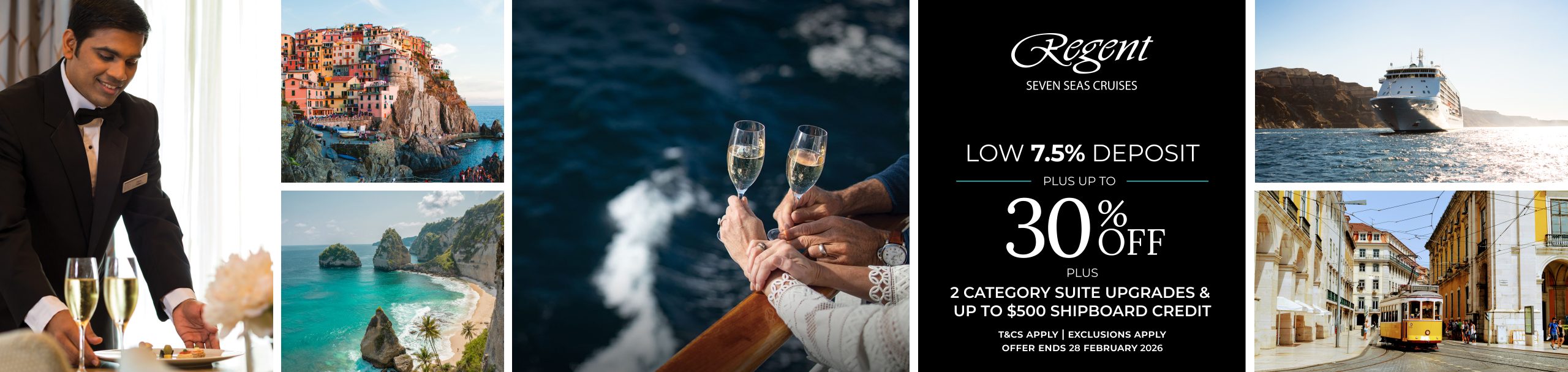 *Up to US$500 Shipboard Credit Per Suite Offer: On select sailings, for bookings made between 13 February 2026 and 28 February 2026, guests will also receive US$250 Shipboard Credit per guest, up to US$500 per suite. Savings and Shipboard Credit amounts are subject to change. Mention ‘Celebration Savings’ at time of booking. Offer applies to select voyages only. For complete Terms & Conditions, including applicable voyages, please visit RSSC.com/Upgrade-Your-Horizon. Offer and applicable voyages may be withdrawn at any time without prior notice. Offer may not be combinable with other promotions, please enquire about combinability at time of booking. Offer is not combinable with Rocky Mountaineer voyages. Regent Seven Seas Cruises® reserves the right to correct errors or omissions at any time. Full terms and conditions apply, see RSSC Legal.