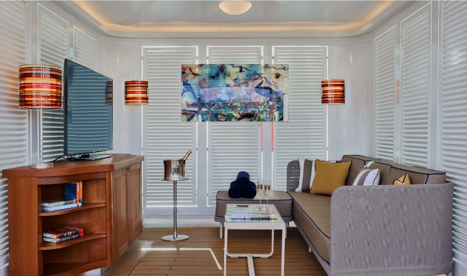 Located on Deck 8; Combine mid-ship suites 849 and 851 for suite 8491 or suites 846 and 848 for suite 8468 for a total inside space of 1,292 square feet (120 square meters) plus two verandas totaling 244 square feet (23 square meters)