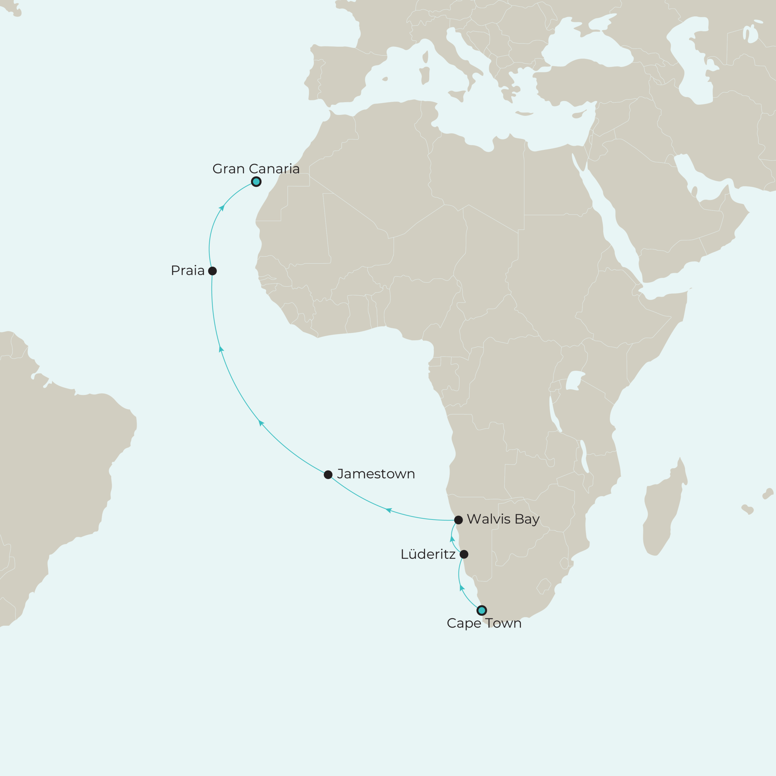 From Namibia’s otherworldly shores to the remote outpost of Saint Helena and the cultural rhythms of Cape Verde, this voyage highlights the dramatic coastlines and rugged landscapes that Africa is known for. Sailing from Cape Town to Gran Canaria, immerse yourself in serene panoramas, where each day offers a new perspective on the world’s beauty.