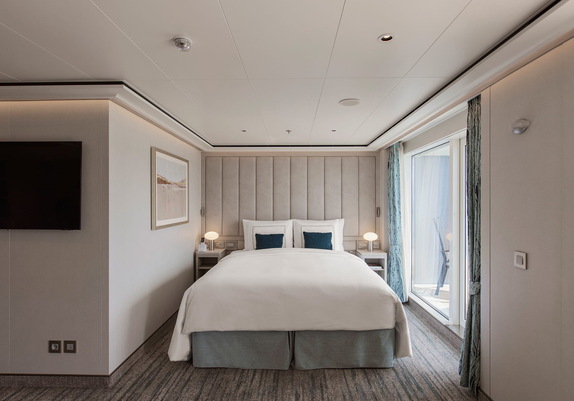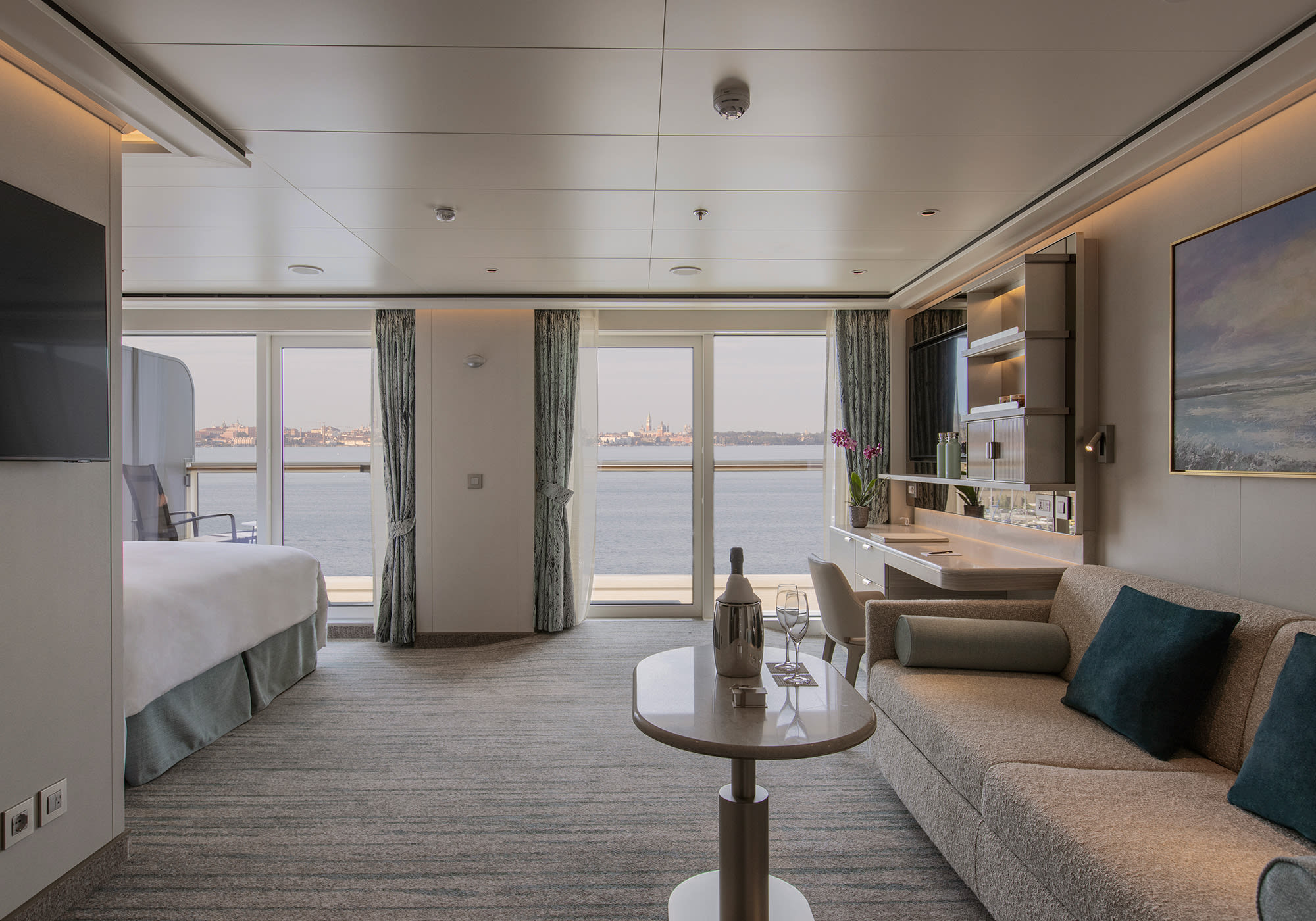 This charming and opulent suite offers a comfortable living space, close to the heart of the ship. Unwind in the sitting area or enjoy the romantic views of the setting sun from your private veranda.