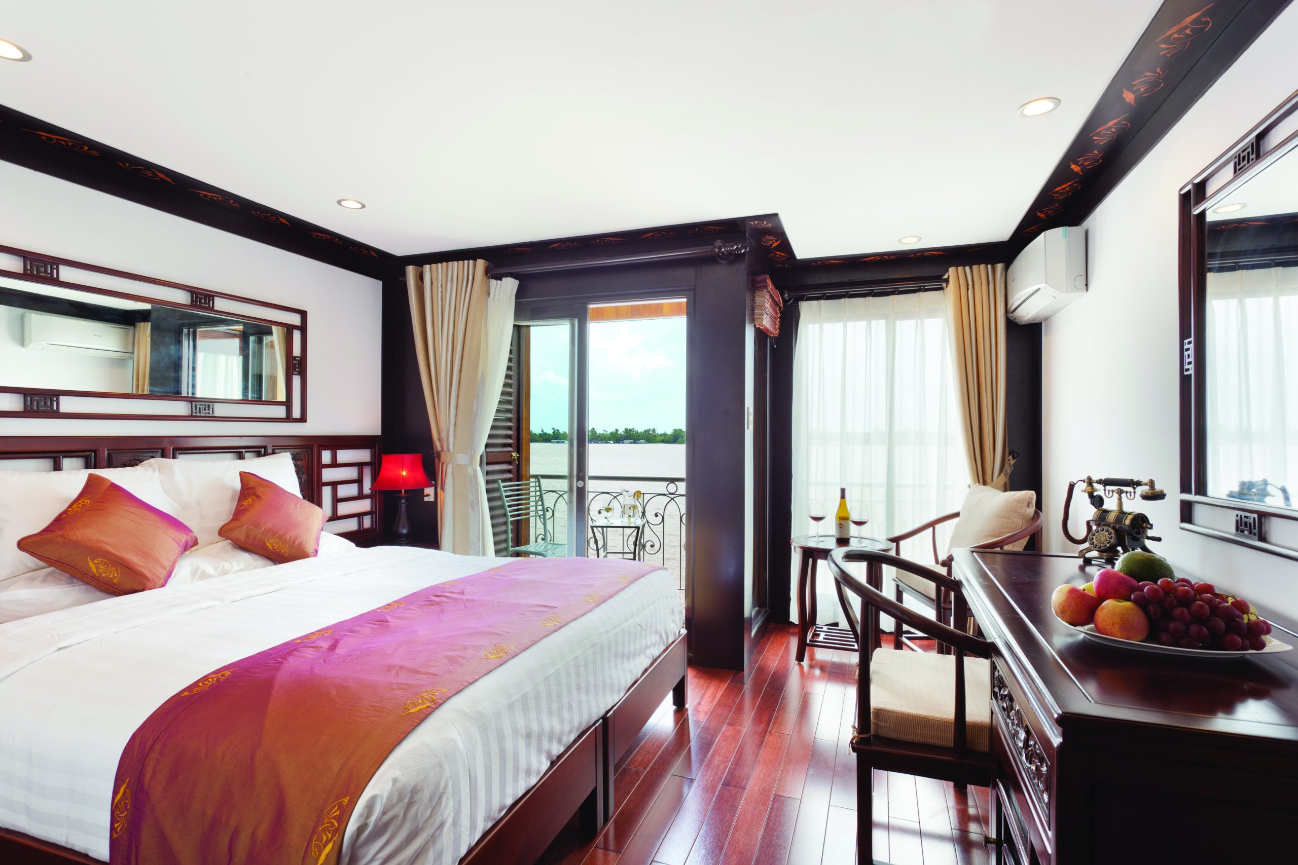 RV Lotus’ Sadec Twin Balcony Suites are a sophisticated, comfortable way to experience the Mekong. They feature an outdoor balcony, allaowing you to relax and watch the world go by, and come equipped with luxurious amenities, such as plush bedding and a flat-screen TV. Enjoy scenic river views from the comfort of your suite, making it an excellent choice for a memorable river cruise.