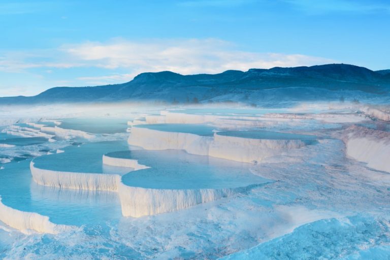 Visit the UNESCO Ancient City of Hierapolis to explore “Cotton Castle”, a geological marvel where thermal springs create a terrace of white baths.