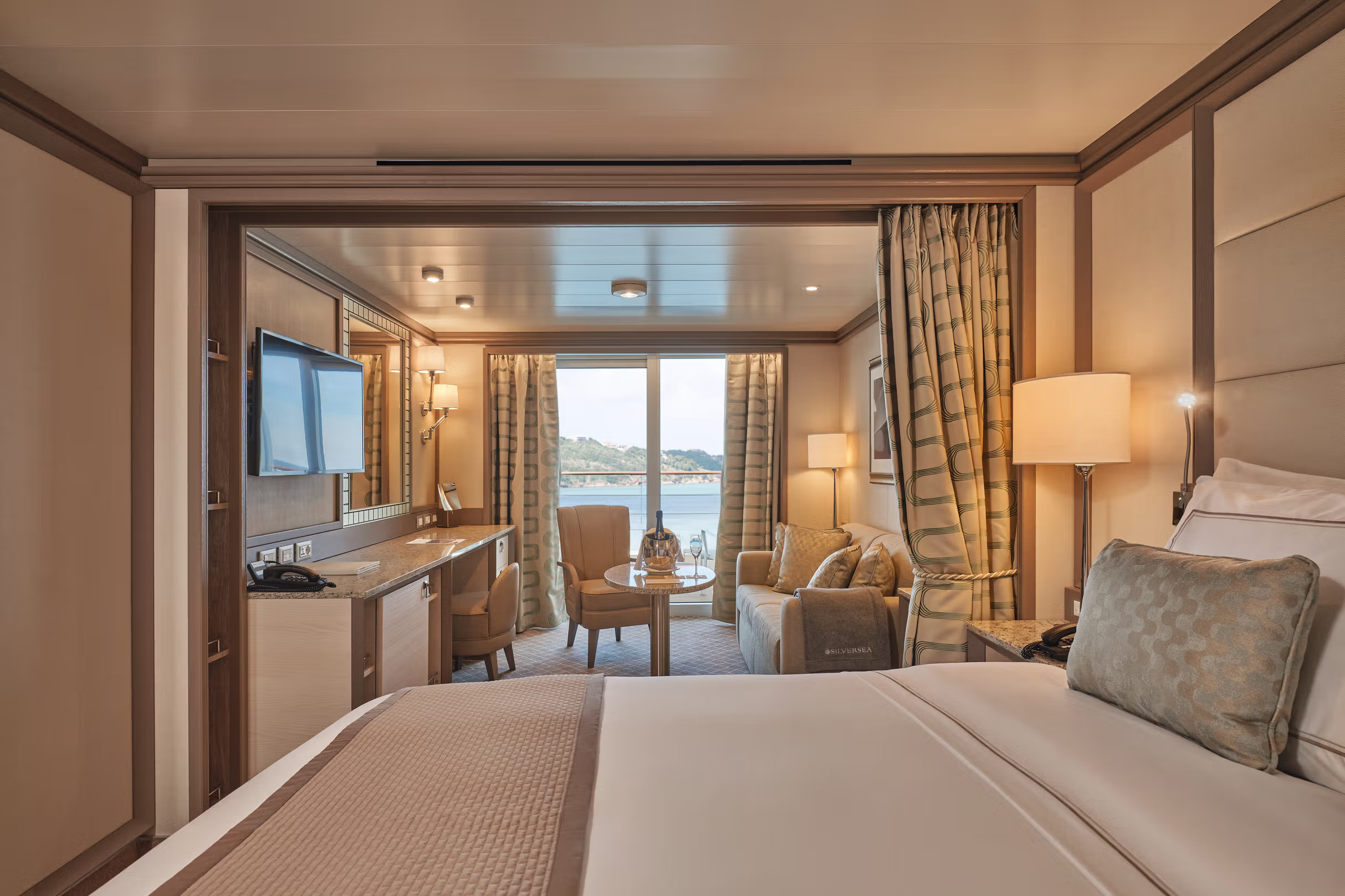 A Silversea Cruises signature, the Veranda Suite is spacious and welcoming. Awaken each morning to daylight bursting through the cabin from the floor-to-ceiling glass doors and unwind on the furnished private teak veranda.