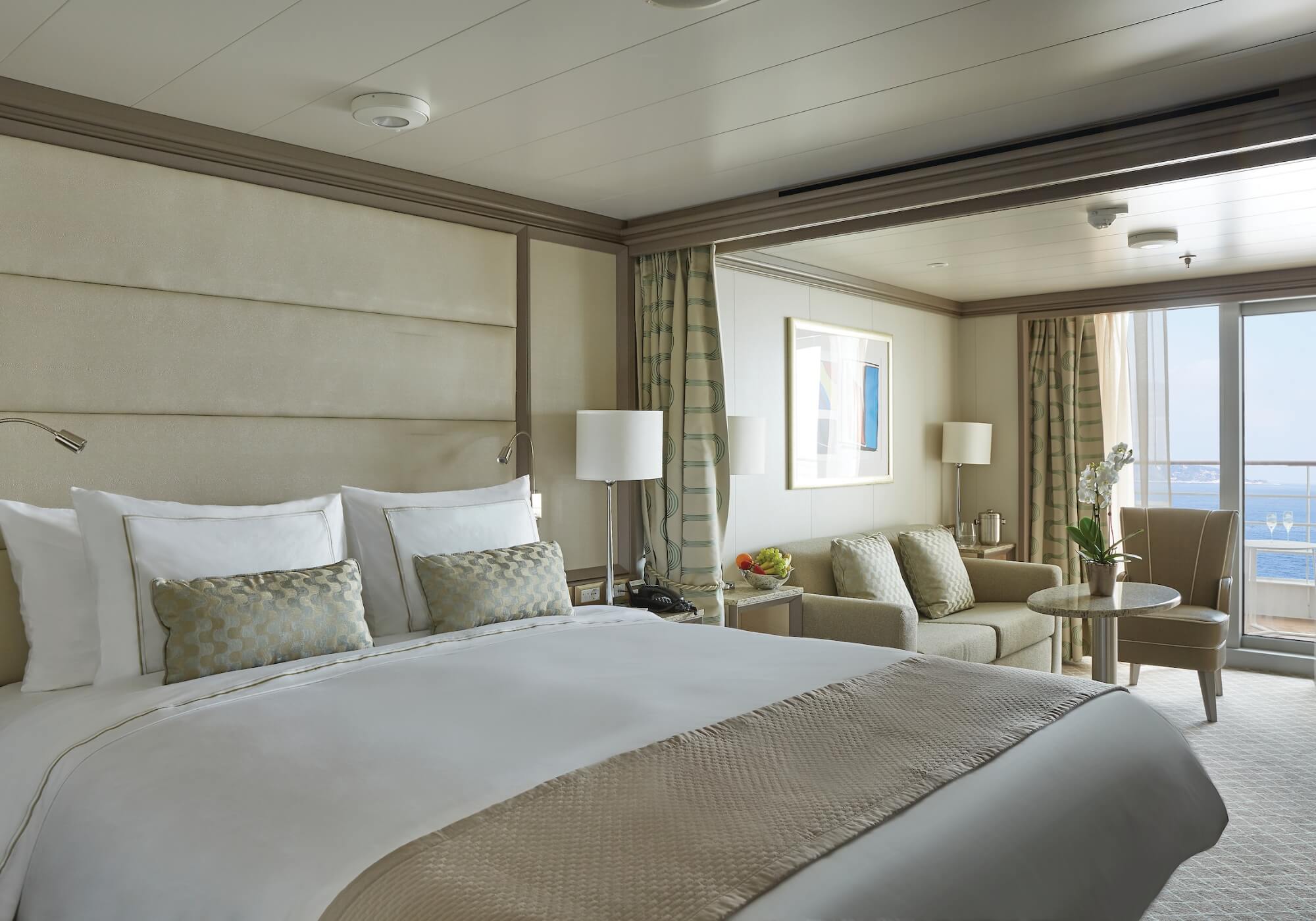 This charming and opulent suite offers a comfortable living space, close to the heart of the ship. Unwind in the sitting area or enjoy the romantic views of the setting sun from your private veranda.