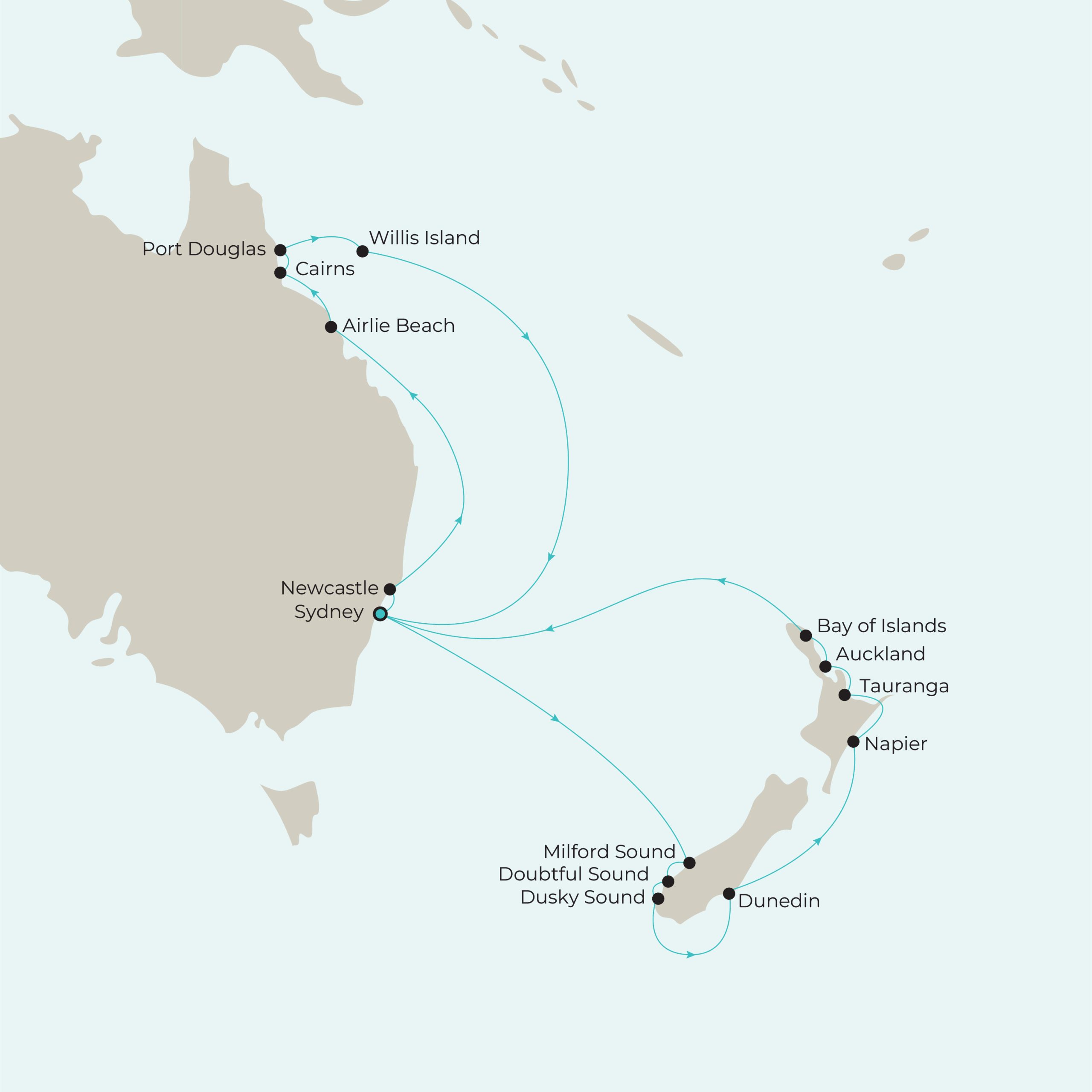 Next, sail onwards to New Zealand’s striking shores. Fiordland National Park’s pristine wilderness gives way to the dynamic ambience of Auckland and the Bay of Islands’ secluded coves – before returning to Sydney ahead of your journey’s next chapter. The gateway to your Australian exploration, Airlie Beach beckons with its swaying palms. From here, encounter the relaxed tropical charm of Yorkey’s Knob, the diversity of Port Douglas, and the untouched sanctuary of Willis Island.