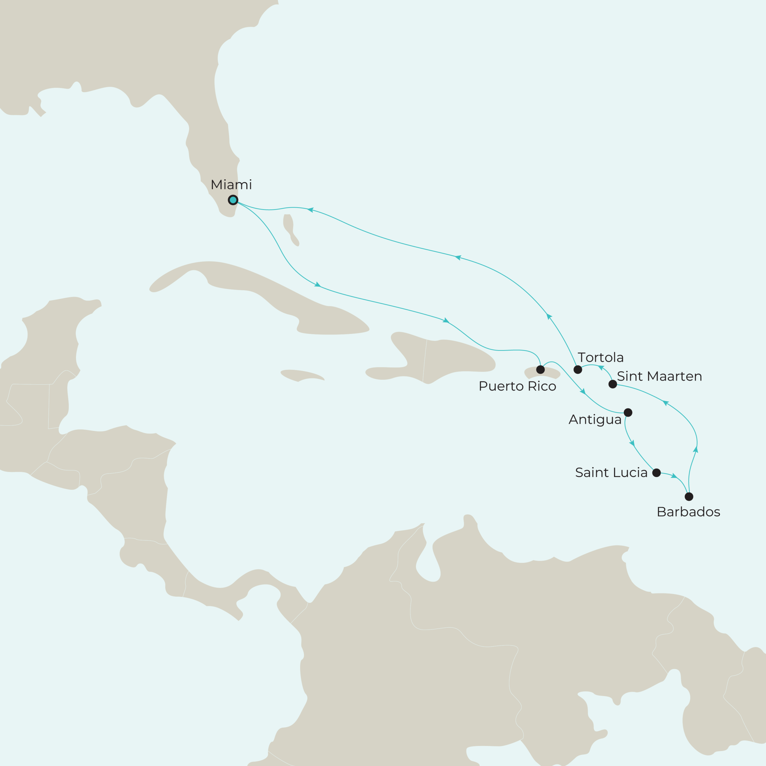 Step into the grandeur of art deco design, impeccable white-glove service, and exquisite dining that has made Cunard synonymous with excellence. Each day reveals a new island paradise — from the colonial charm of San Juan and the pastel hues of Antigua to the lush rainforests of Saint Lucia and the golden sands of Barbados. You’ll then continue through turquoise waters to the cosmopolitan energy of Sint Maarten and the serene beauty of Tortola, before returning to Miami as your unforgettable journey comes full circle.