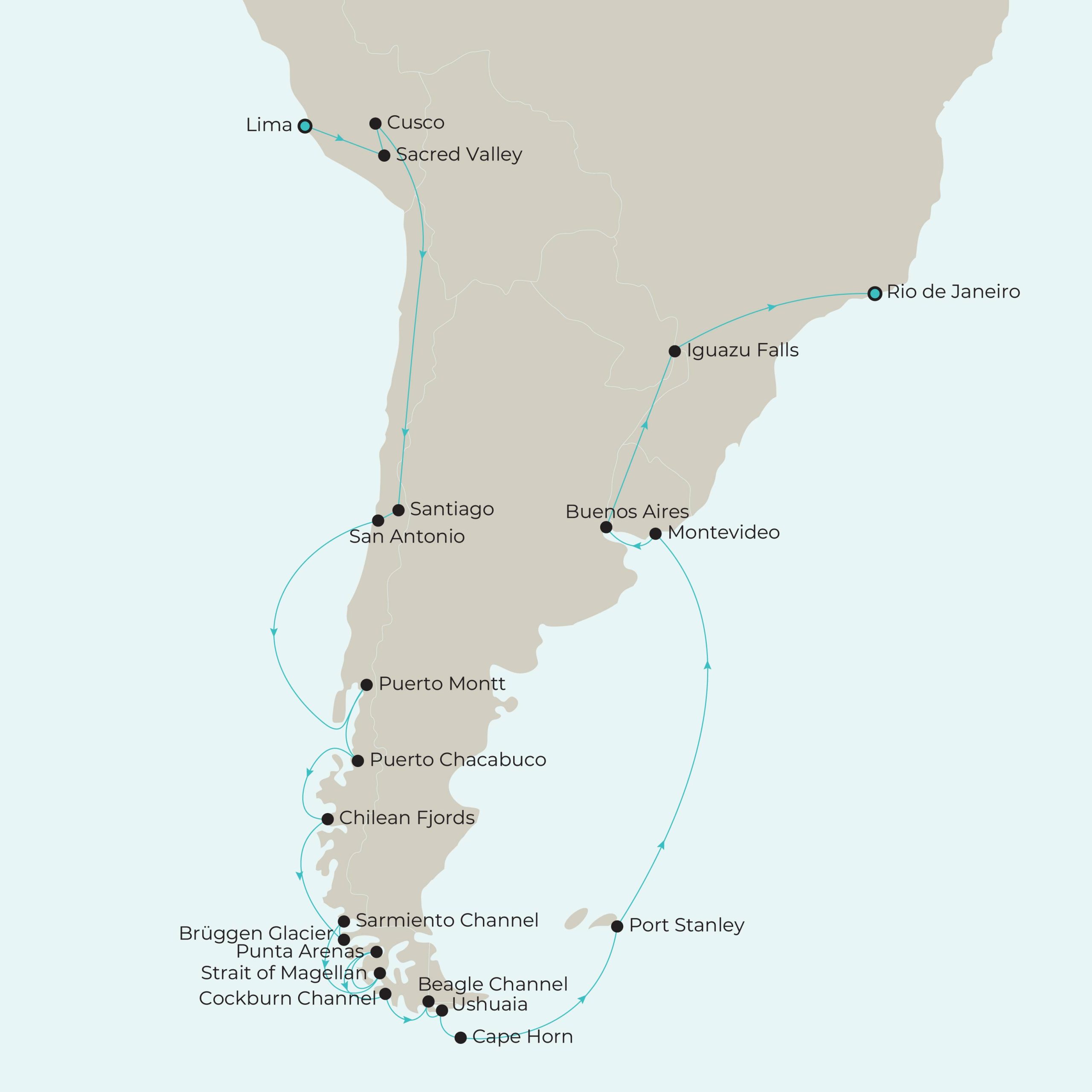 From the marvels of Machu Picchu to the tumbling cascades of Iguazu Falls, embark on the ultimate South American adventure, complemented by a Chilean Fjords cruise.