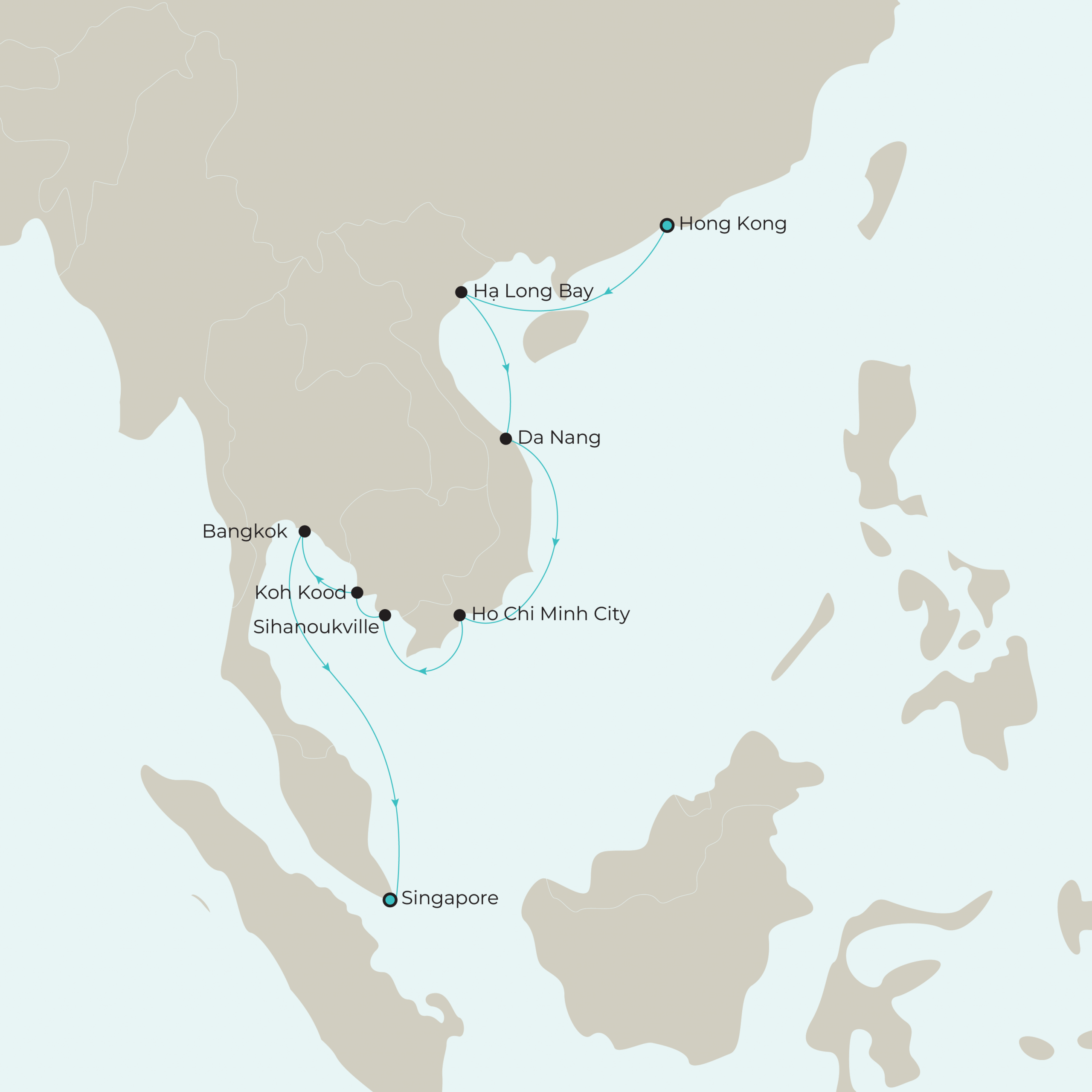 Immerse yourself in the diverse charms of Vietnam: from an overnight in port in Ho Chi Minh City, to the imperial grandeur of Da Nang, and the stunning limestone karsts of Hạ long Bay. Embrace the serene beaches of Cambodia’s Sihanoukville, admire the tranquil beauty of Thailand’s Ko Kood, and explore the majestic temples of Bangkok.