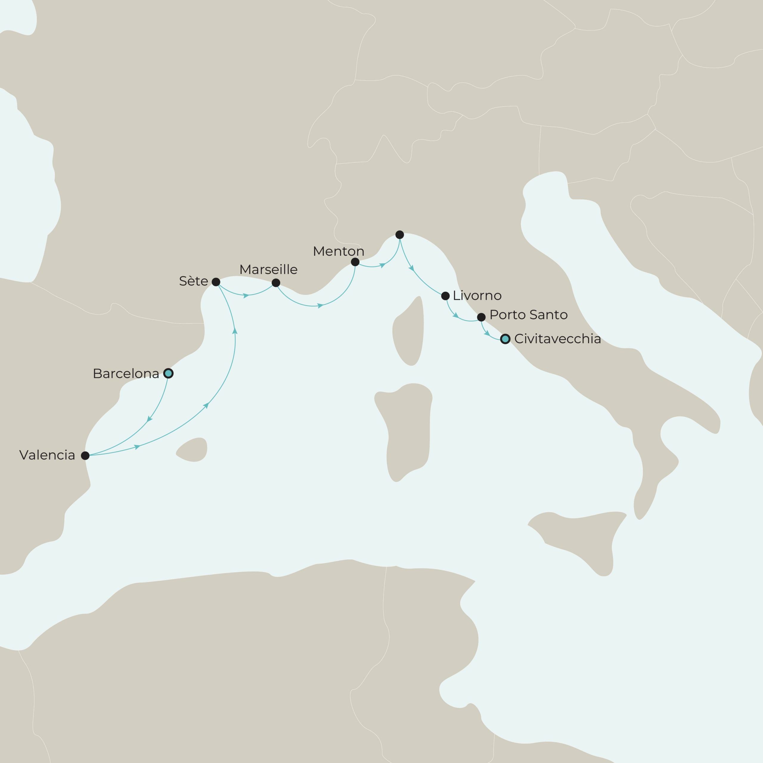 Calling first to Valencia, celebrated for its vibrant culinary scene, you’ll then sail to Sete, a charming French port renowned for its canals and seafood. Next, explore Marseille, and continue to Menton, the “Pearl of France”, famous for its picturesque Old Town and lemon-scented charm. Discover Genoa’s rich maritime history before an overnight stay in Livorno provides the perfect gateway to Tuscany’s treasures. Next, journey to Porto Santo Stefano, a quaint Italian seaside village before disembarking in Civitavecchia.