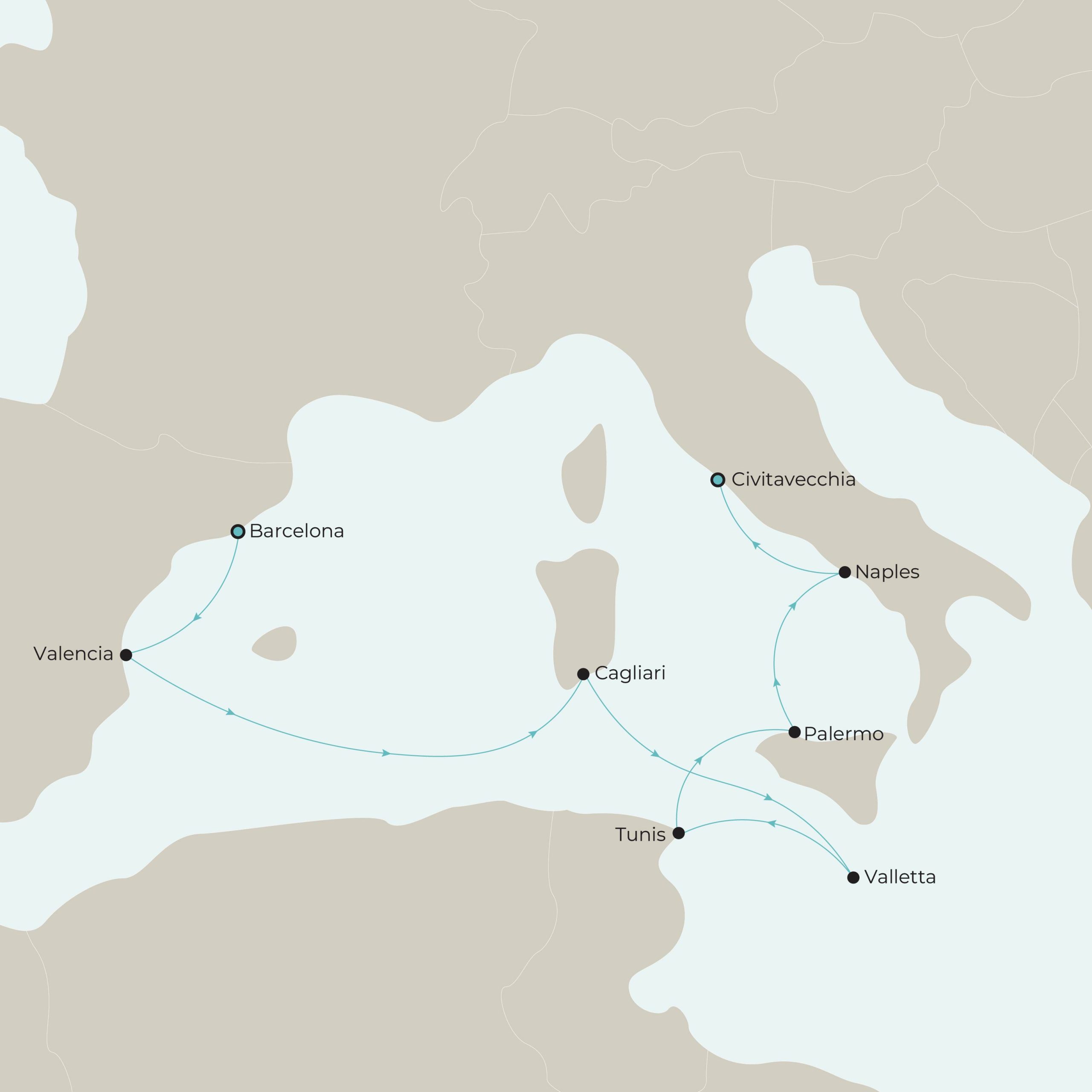 Calling first to Valencia, known for its futuristic architecture and authentic paella, you’ll then continue to Cagliari, Sardinia’s historic gem, followed by an overnight stay in Valletta, where Baroque architecture and rich history await. Explore Tunis, with its ancient Carthage ruins and lively markets, before heading to Palermo. In Naples, discover the Amalfi Coast, Pompeii, or the city’s famous culinary delights, before disembarking in Civitavecchia where your holiday ends.